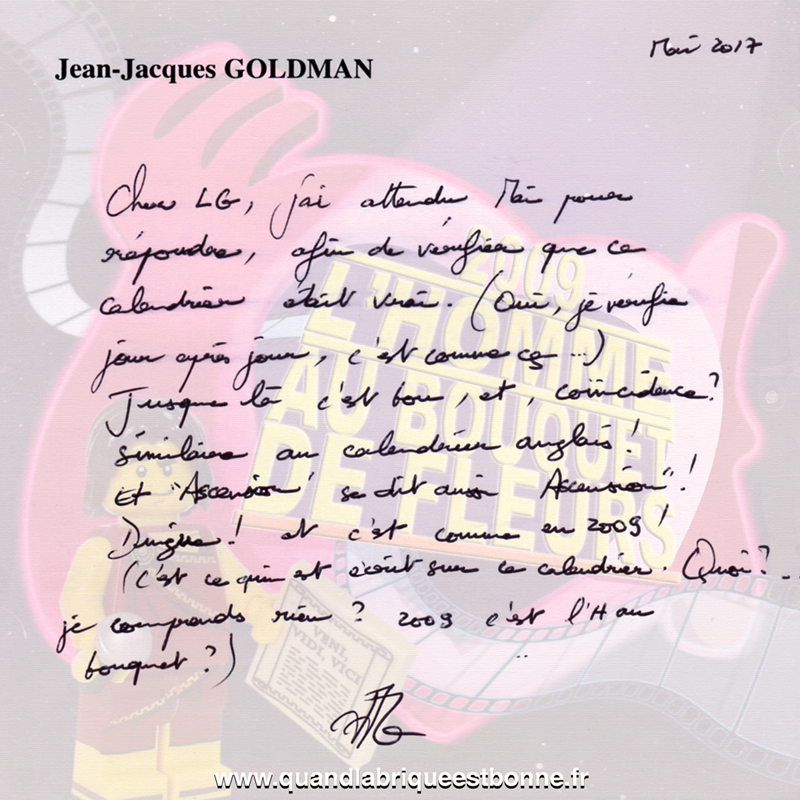 27/05/2017 : Jean-Jacques Goldman apprécie son calendrier Lego Goldman spécial "Enfoirés".